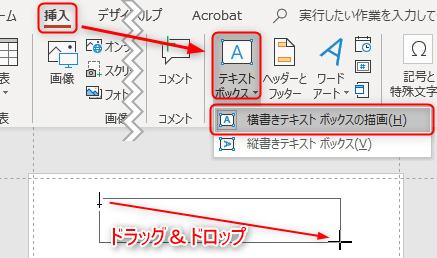 [挿入] > [テキストボックス] > [横書きテキストボックスの描画] の順にクリックします。