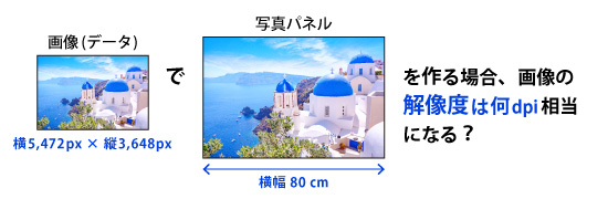 【例】デジカメで撮影した画像 (横5,472px × 縦3,648px) で、横幅80cm の写真パネルを作りたい。この場合、解像度は何dpiになる?