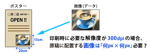 【例】印刷した時に画像部分が横20cm×縦15cm程度の大きさになるようにポスターを作成したい。印刷サイズでの必要解像度が300dpiの場合、最適な画像サイズは?