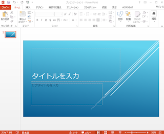 パワーポイント2013以降は、新規作成で出てくるスライドは「ワイド画面」で横に長くなったことがわかります。