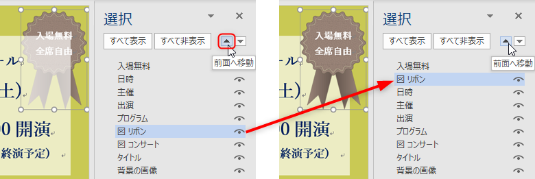 今回はリボンを「日時」と「入場無料」の間に置きたいので「前面へ移動」していきます。